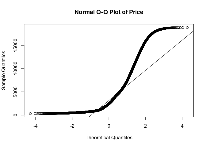 qq_diamonds <- qqnorm((diamonds$price),main="Normal Q-Q Plot of Price");qqline((diamonds$price))