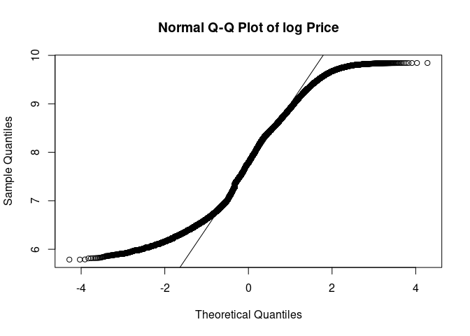qq_log_diamonds <- qqnorm(log(diamonds$price),main="Normal Q-Q Plot of log Price");qqline(log(diamonds$price))