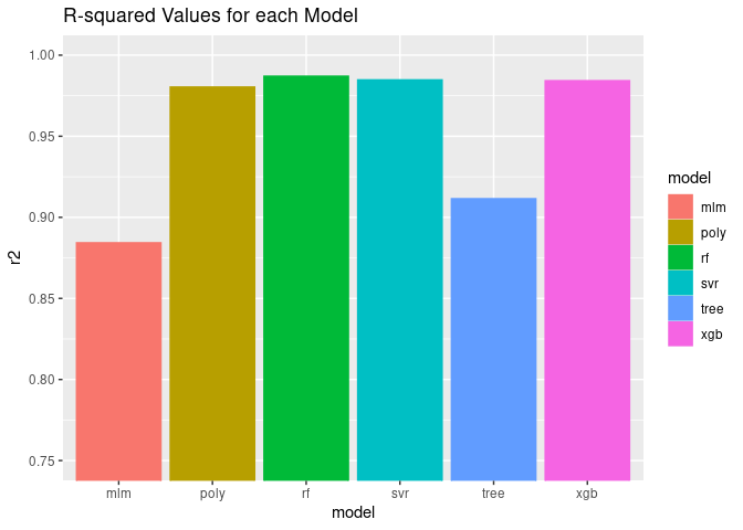 r2_plot + ggtitle('R-squared Values for each Model') + coord_cartesian(ylim = c(0.75, 1))