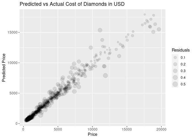 geom_point(alpha = 0.1) + labs(title = 'Predicted vs Actual Cost of Diamonds in USD', x = 'Price', y = 'Predicted Price', size = 'Residuals')
