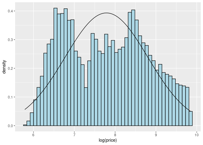 Based on the Q-Q plots and the histogram, it appears that the log of the price follows a bimodal or multimodal distribution. Let try another couple plots to see.