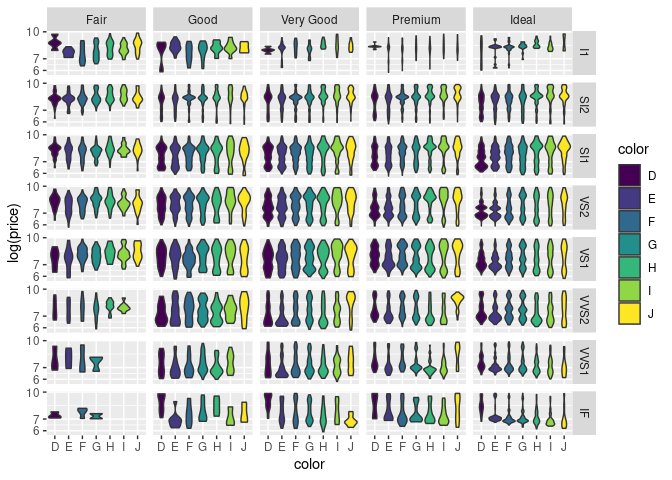 violin + geom_violin() + scale_y_log10() + facet_grid(clarity ~ cut)